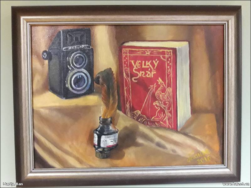Marija Banha - Zátiší foťák olejomalba na platně