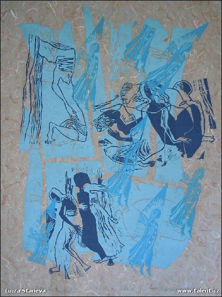 Popis: Grafický ruční tisk III/VI, lino na ručním textilním papíru, kombinované s monotypním podkladem.