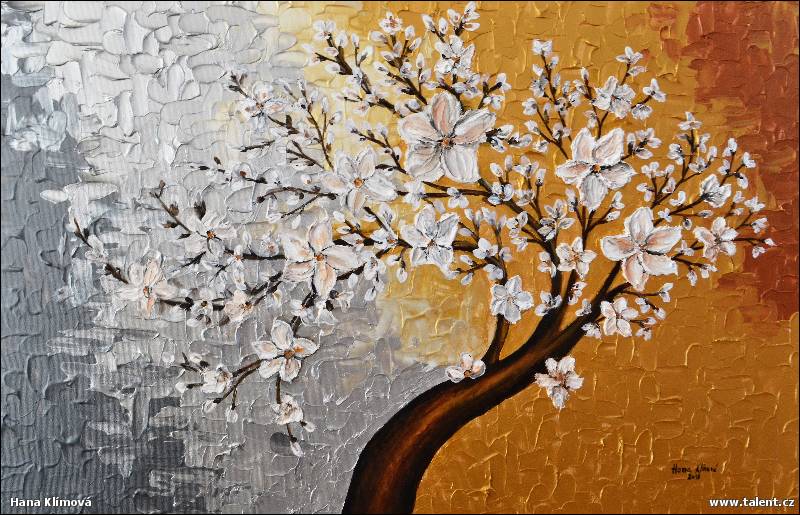 Něžné jabloňové kvítky jsou plastické, vytvořené pastózní hmotou a vystupují tak z pozadí, na kterém jsou využity reliéfní efekty v metalických barvách, hlavně stříbrná a zlatá. Na pozadí tak vznikají zlaté a stříbrné odlesky, které dodávaj