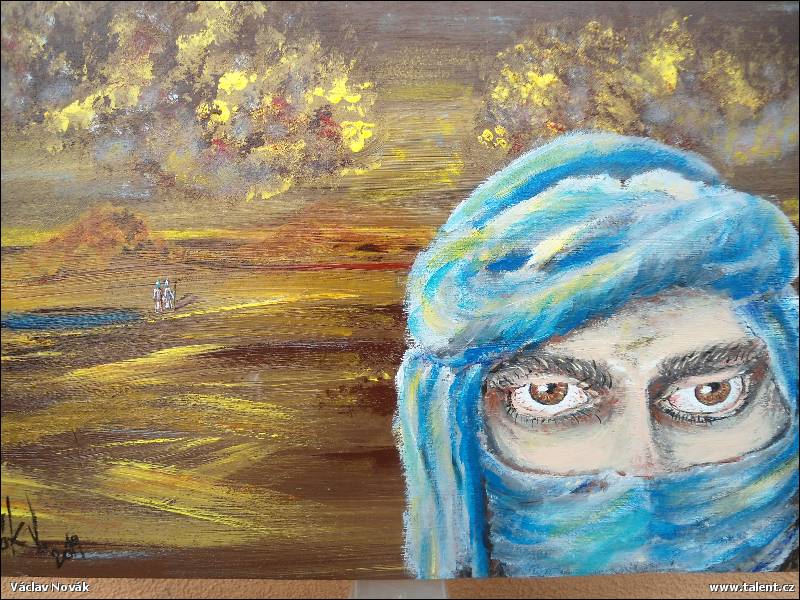 | Popis: | Poušť, ubíhající krajina s berbery,v popředí král pouště-Tuareg |
