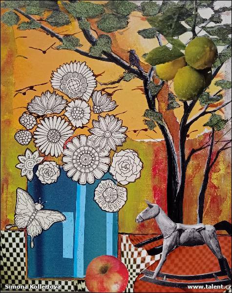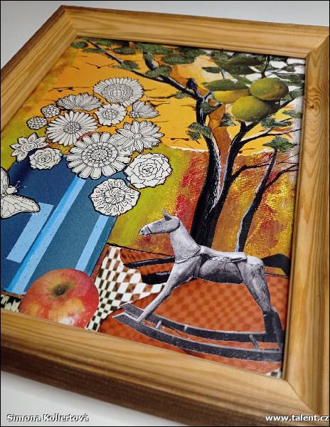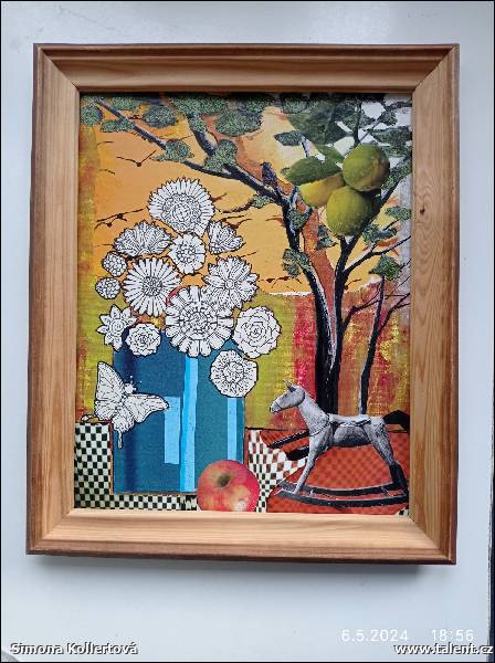Popis: Domalovávaná koláž na desce potažené plátnem. Rozměry jsou bez rámečku. Cena je i včetně dřevěného rámečku.